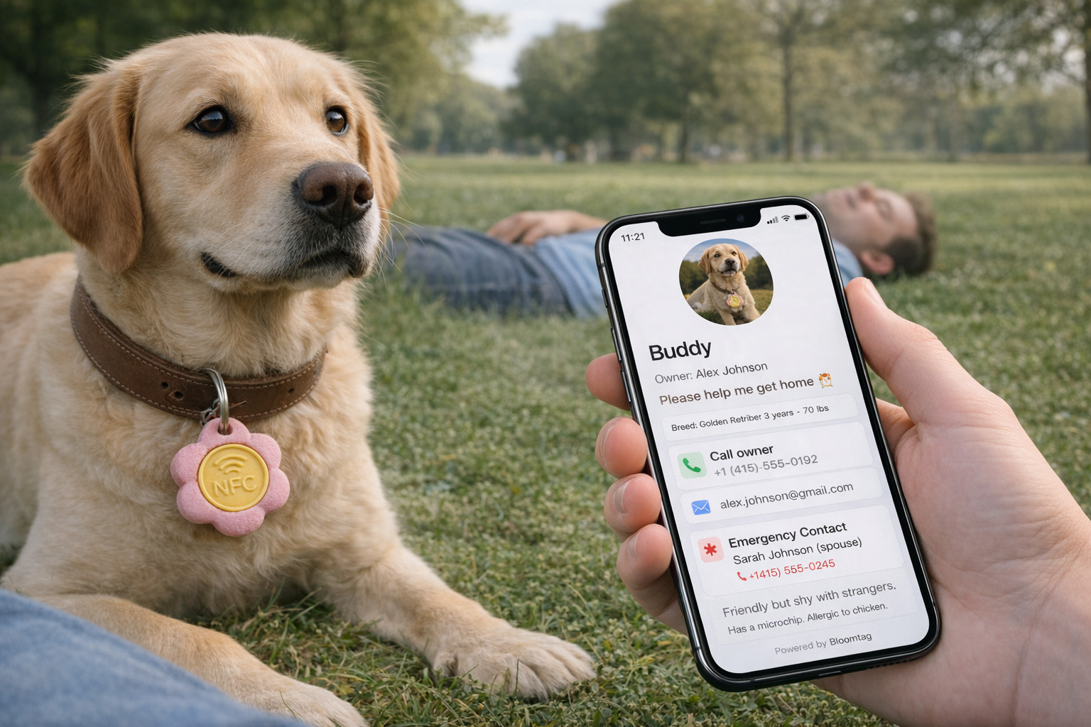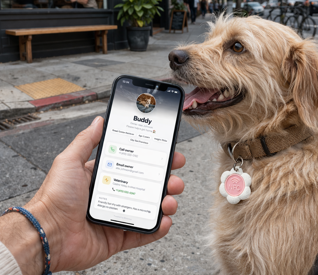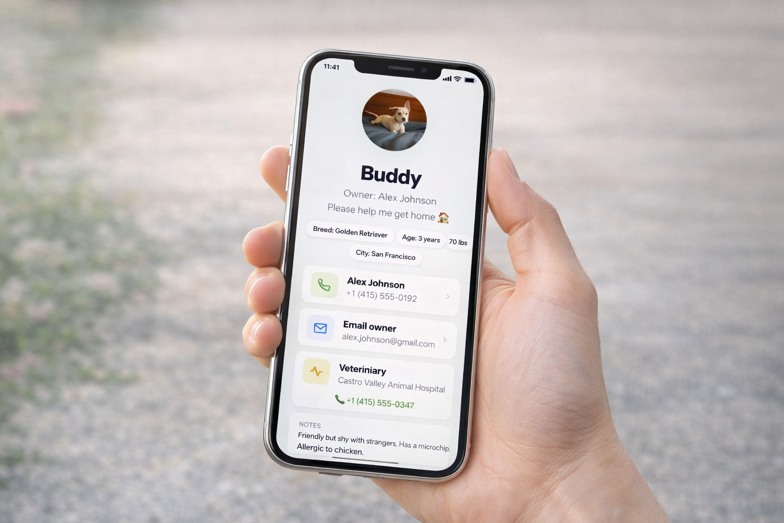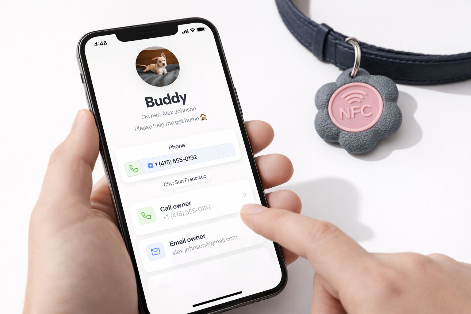 If your pet goes missing, the finder taps the tag — your number appears instantly.